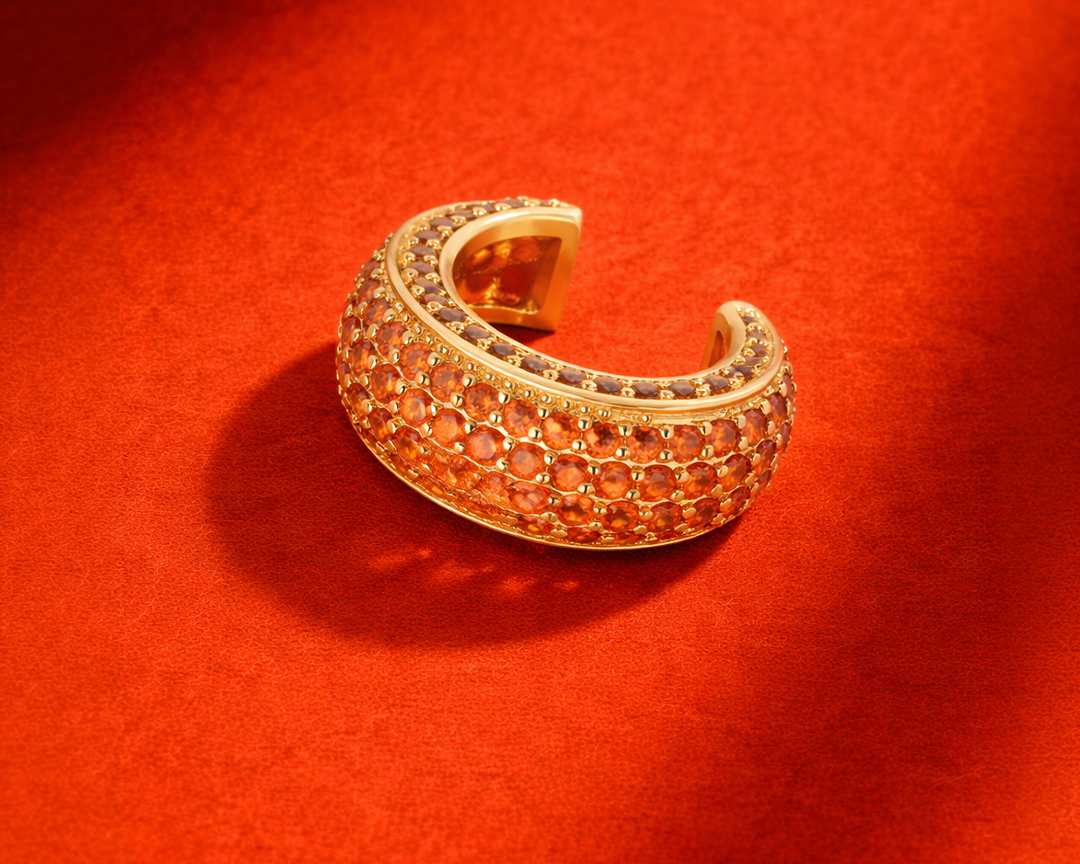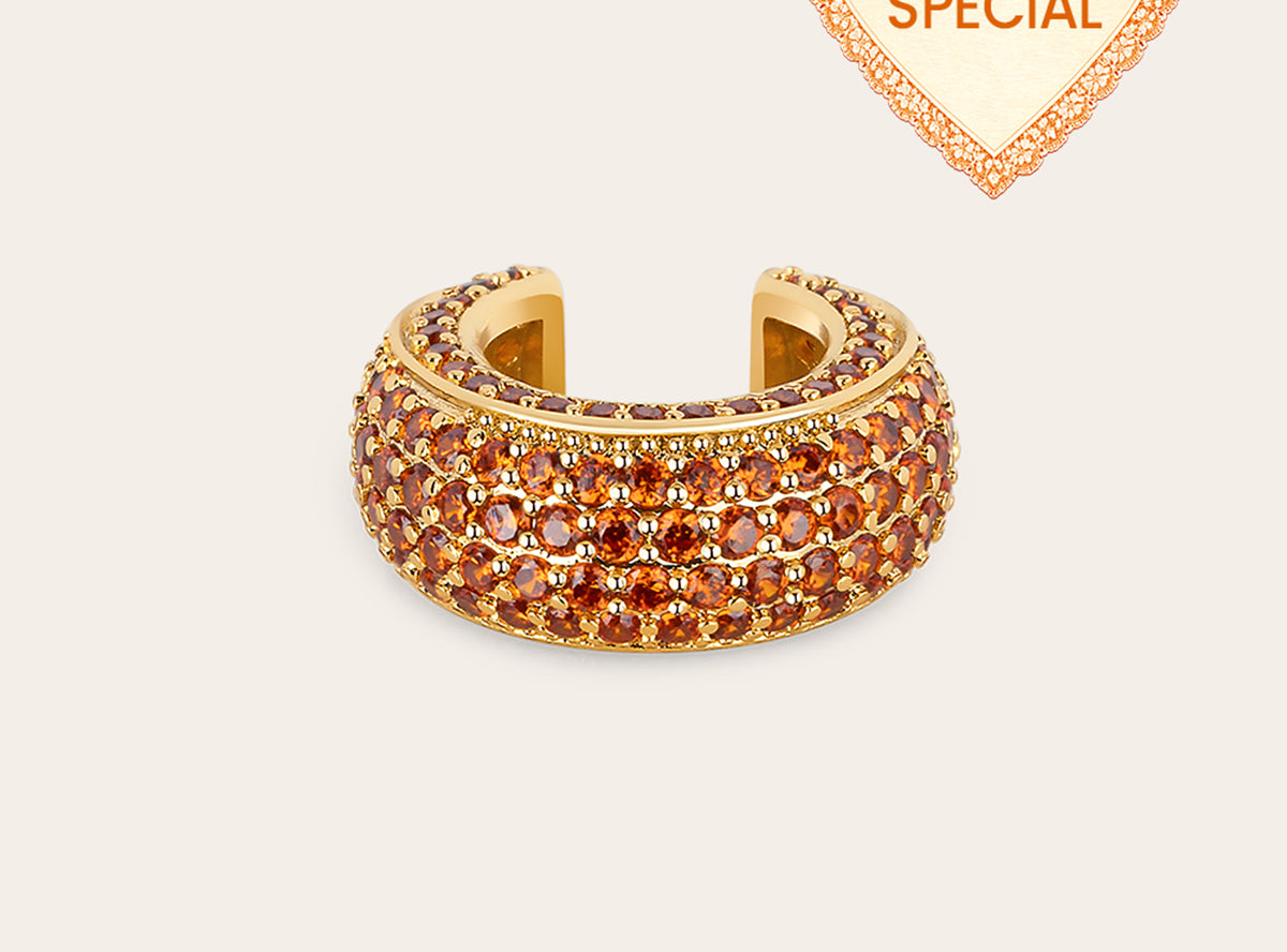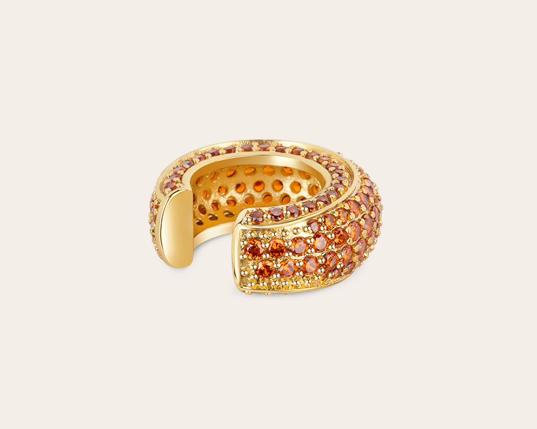 Getaucht in leuchtendes Orange legt sich dieser Ear Cuff um dein Ohr und sorgt für ein intensives Funkeln, das jeden Sonnenstrahl und jede Golden Hour Reflexion einfängt. Von vollen Straßen über Drinks an den Grachten bis hin zu tanzenden Booten, er verleiht jedem Look diesen mühelosen, ausdrucksstarken Glow.