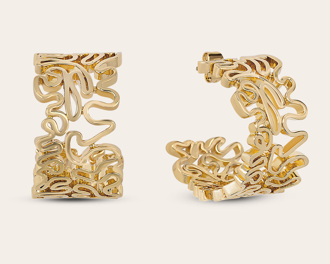 Von vorne sind sie reine Bewegung: goldene Linien, die sich winden und schlingen, als wären sie von Hand gezeichnet, fast schwebend. Von der Seite bilden sie einen klassischen, geschwungenen Hoop mit einem subtilen Twist. Das ausgestanzte Design macht sie leicht und luftig, während das polierte Gold genau den richtigen Glanz verleiht.