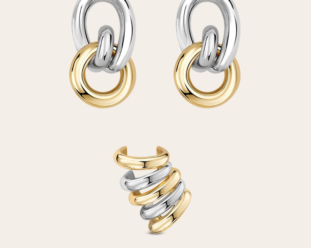 Manche Dinge sind einfach besser zusammen. Die Luca Ohrringe und die Alba Ear Cuff vereinen markantes Design mit zeitloser Eleganz und verbinden Silber und Gold zu Schmuckstücken, die sowohl modern als auch klassisch wirken.