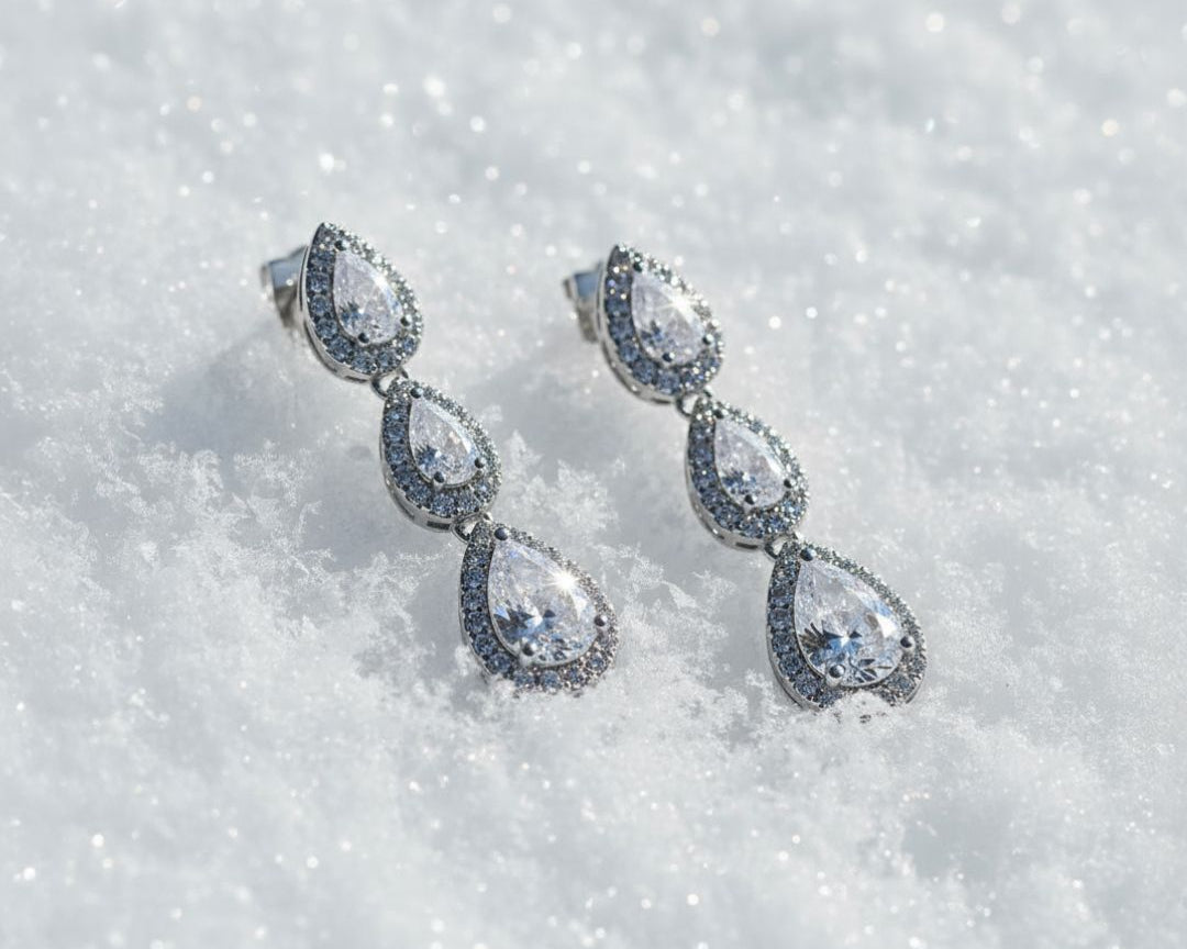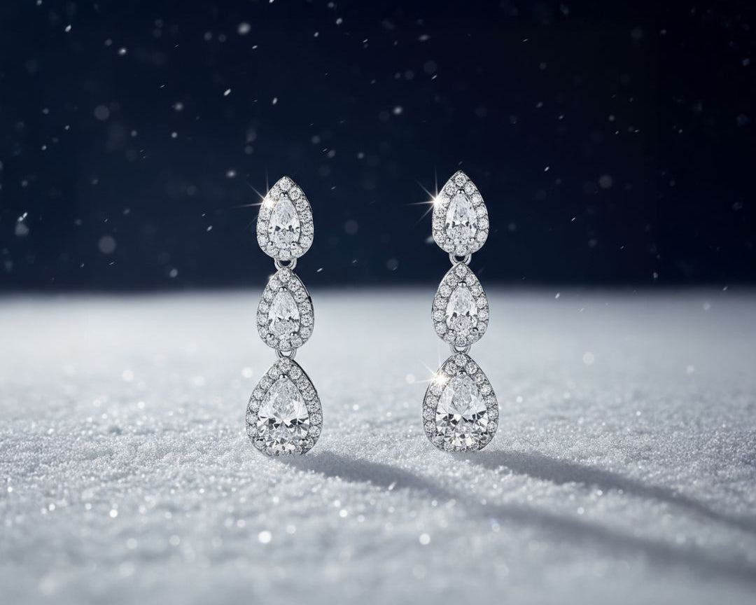 These silver-plated earrings feature three teardrop zirconia stones framed with delicate halos, creating a refined sparkle that catches the light with every turn. Elegant and understated, they bring a sense of classic sophistication to any occasion.