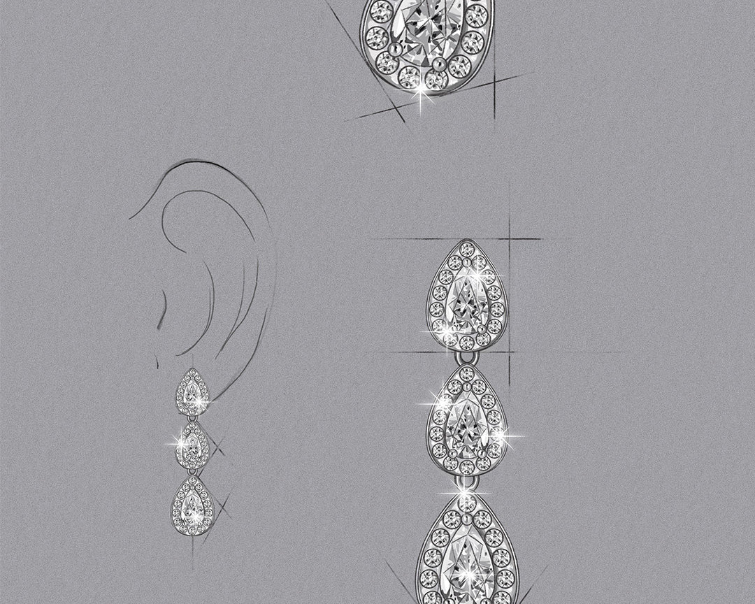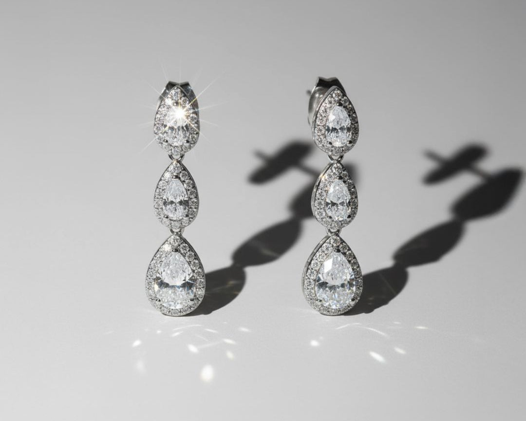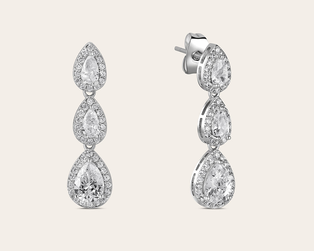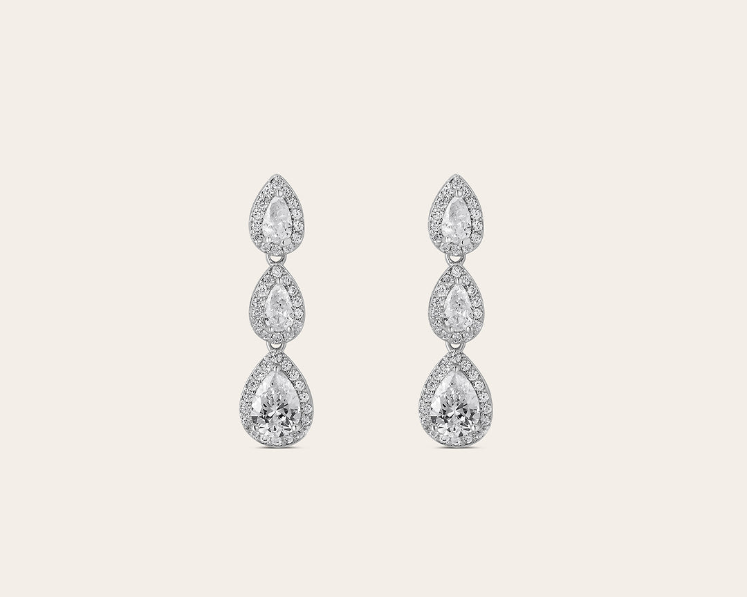The Vivien earrings feature three teardrop zirconia stones framed with delicate halos, creating a refined sparkle that catches the light with every turn.