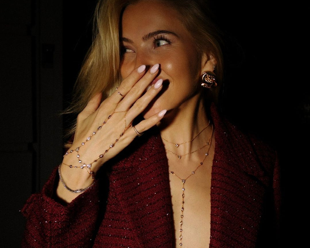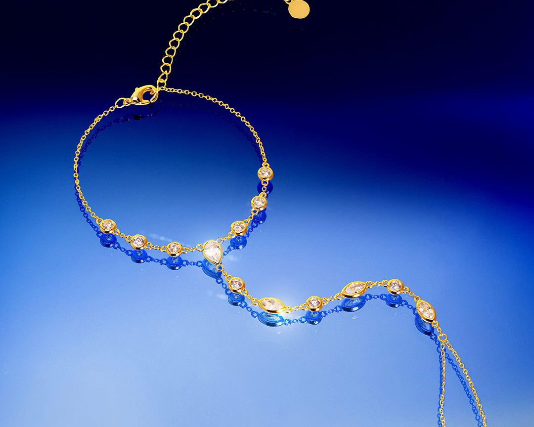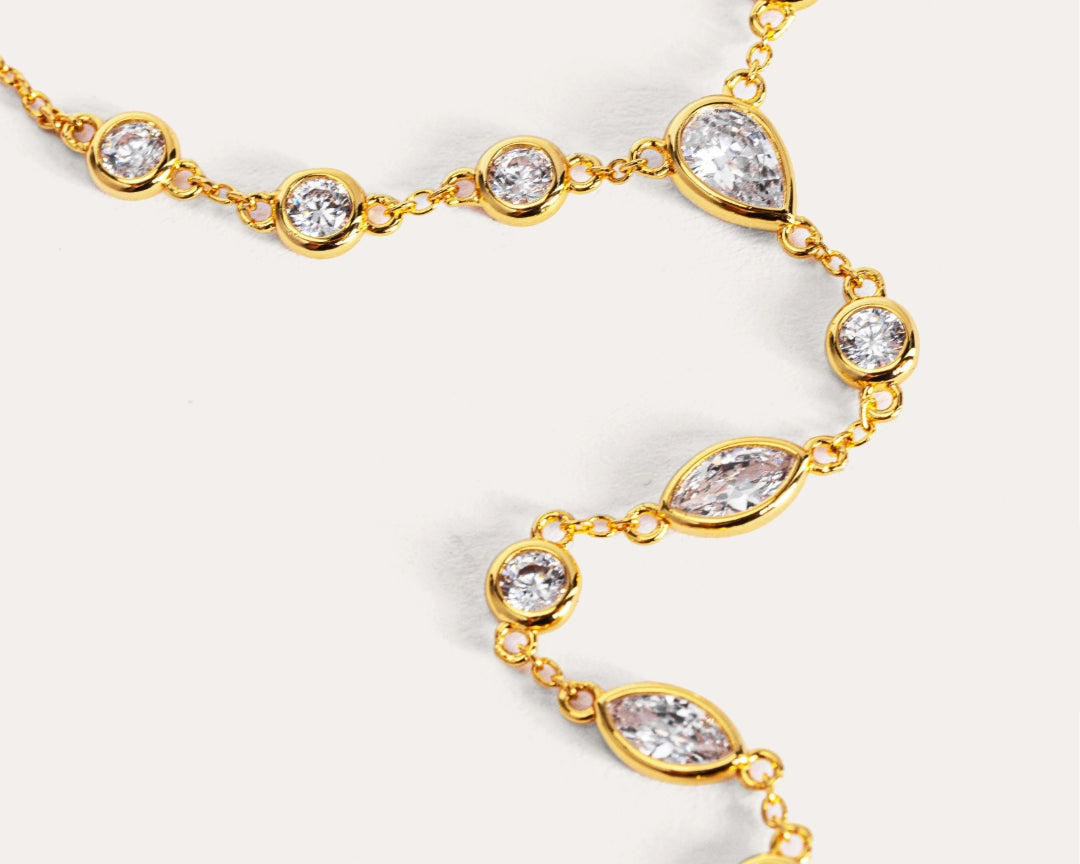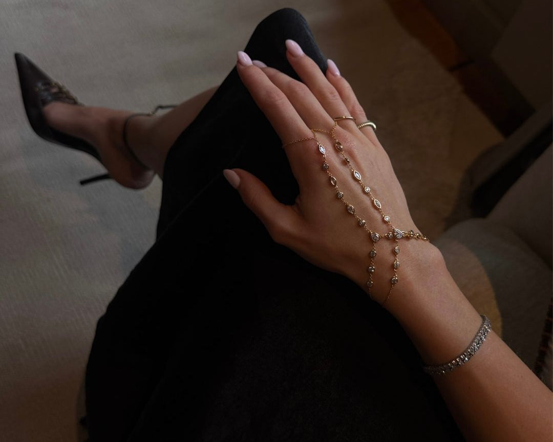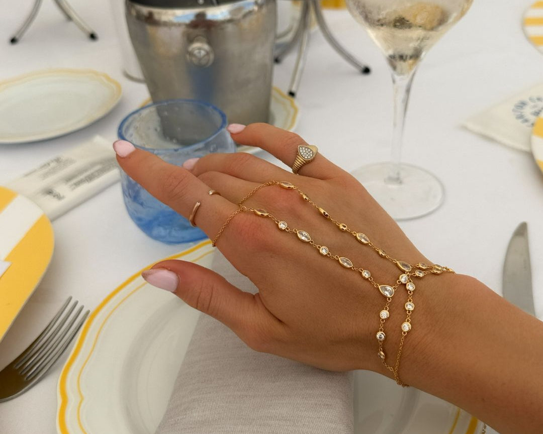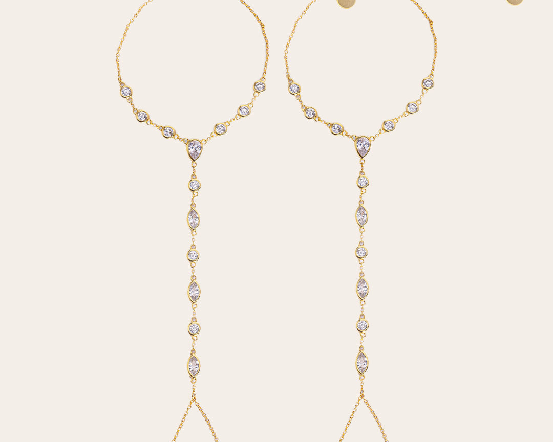Two Aurelia Gold hand chains together create a look that can’t be ignored. Subtle and elegant at one moment, bold and powerful the next exactly how you want to wear your style.With 13 shimmering zirconia stones on each chain, they catch the light with every move. Wear both for a striking high-fashion statement, or share one with someone who understands your sense of style.