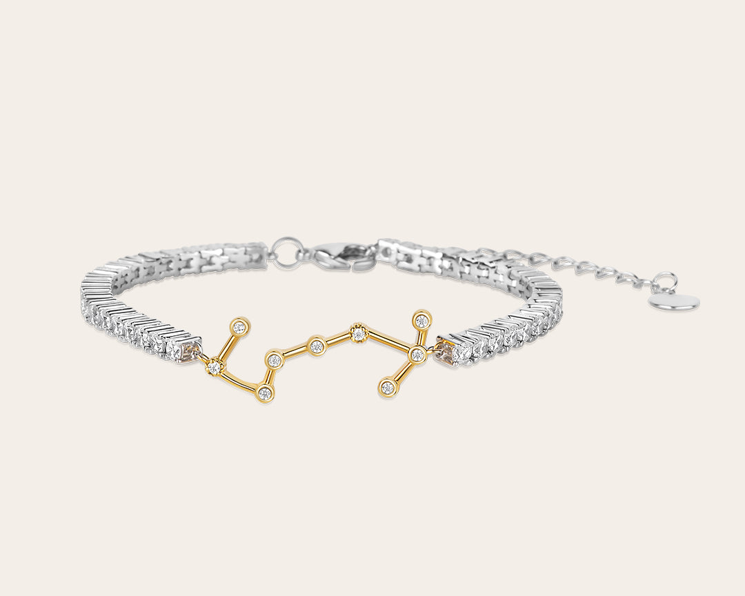 Le bracelet Eclipse Scorpion (23 oct. – 21 nov.) capture l’énergie intrépide et la confiance intemporelle du signe. Une délicate chaîne tennis sertie de zircons blancs met en avant la constellation du Scorpion symbole de transformation, de force intérieure et de beauté cosmique. Confectionné en métal plaqué or, ce bijou incarne la dualité du signe : doux mais fort, subtil mais éclatant. Une pièce qui rayonne de mystère et de puissance, portée seule ou en superposition, pendant la saison du Scorpion et bien au-delà.