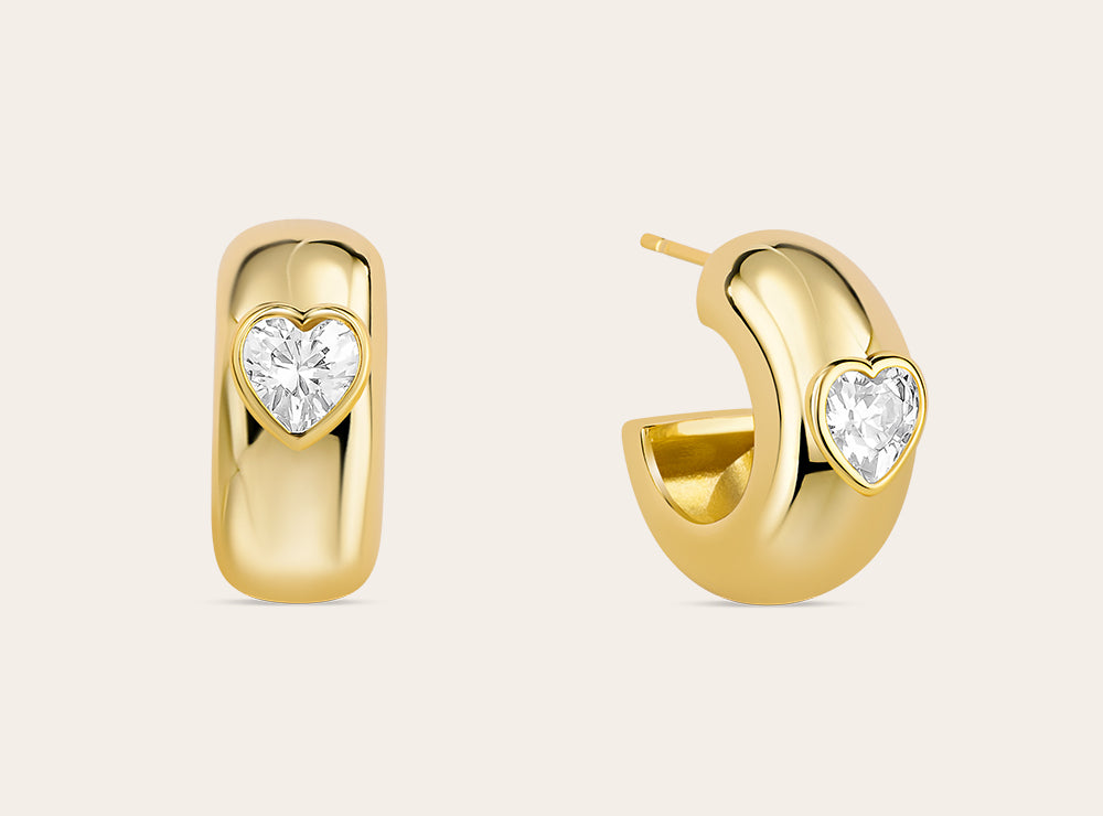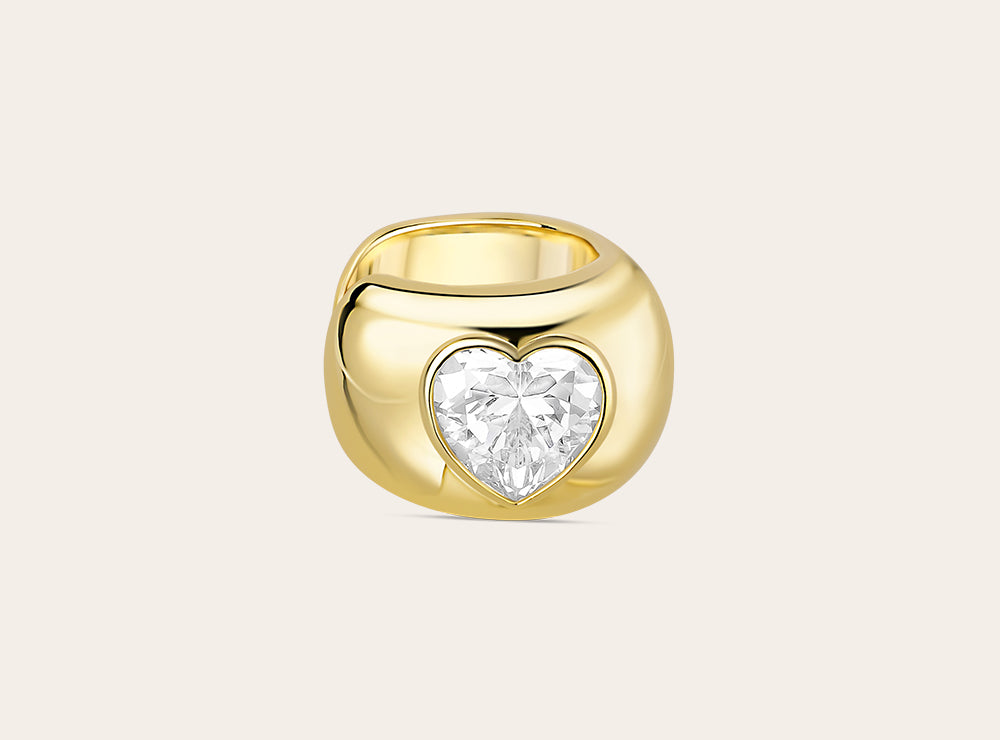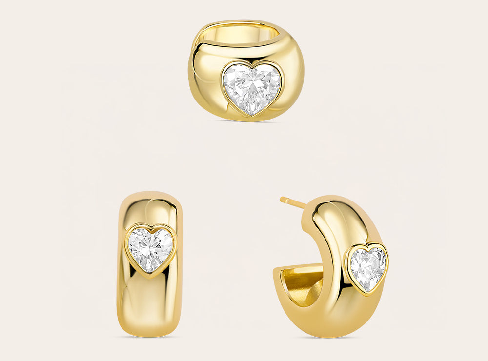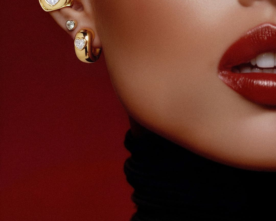 Les créoles Amour se distinguent par leur silhouette pleine et arrondie, sublimée par une finition plaquée or brillante. En leur centre, une zircone en forme de cœur apporte une touche de douceur à cette forme audacieuse, créant un équilibre parfait entre force et délicatesse. Le ear cuff Amour reprend cette harmonie avec sa forme courbée et chunky, ornée d’une unique zircone en forme de cœur, qui épouse délicatement l’oreille sans nécessiter de perçage.