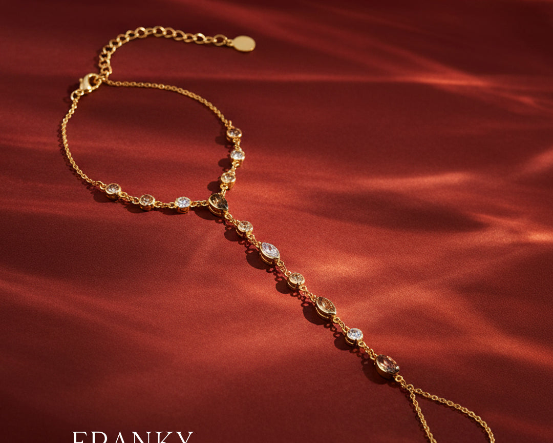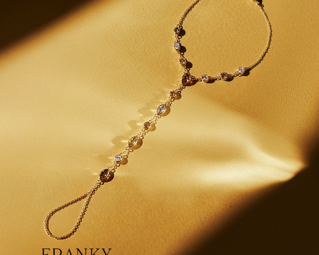 Een echte Franky bestseller, opnieuw ontworpen in samenwerking met Jasmin. De Franky Amsterdam x Jasmin Azizam Aurelia Hazel hand chain vangt de sfeer van het feestseizoen: warm, elegant en moeiteloos chic.