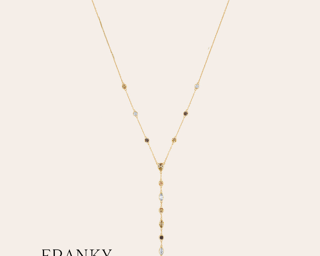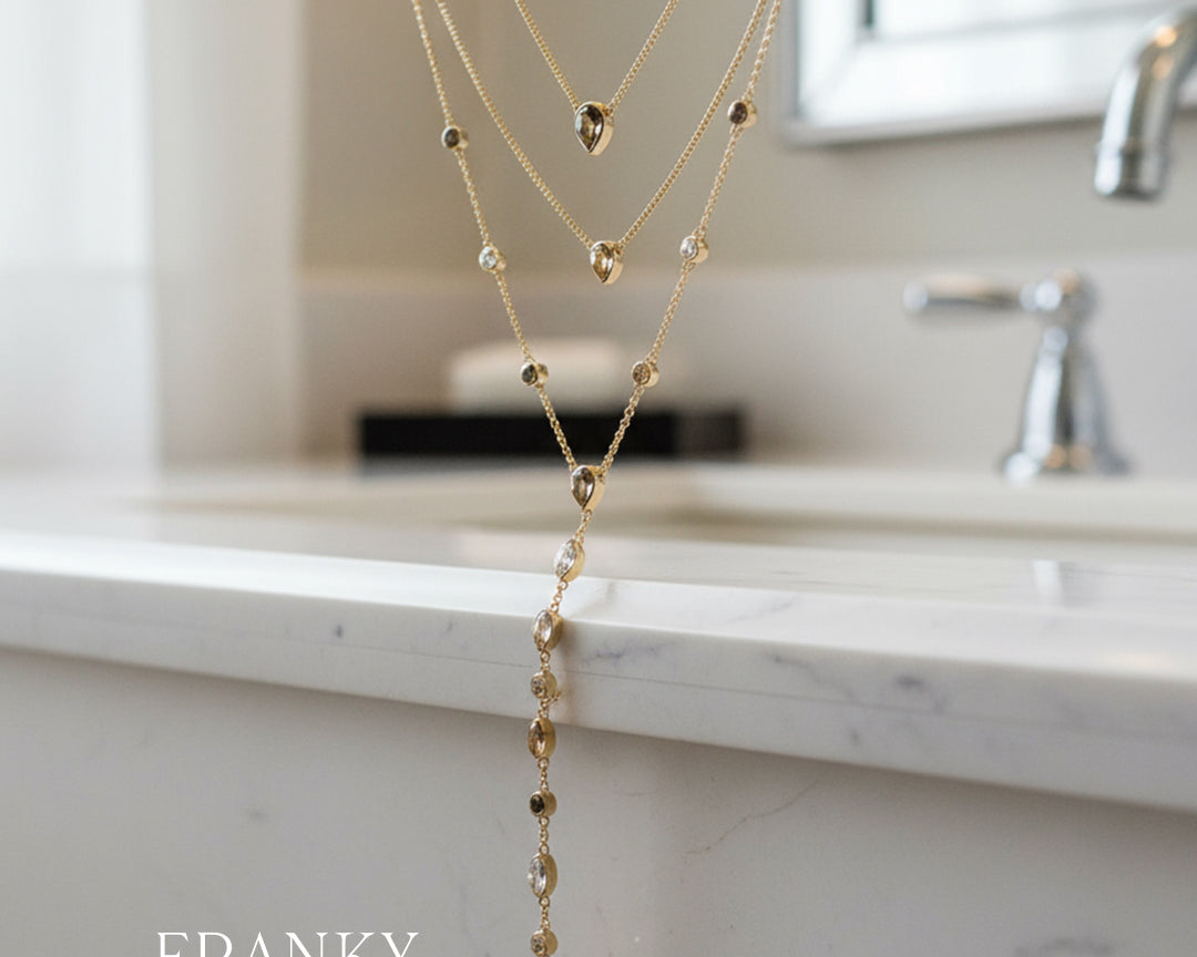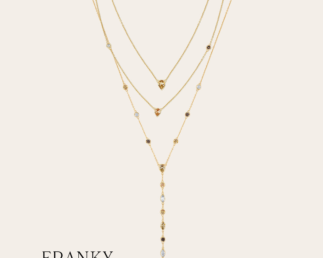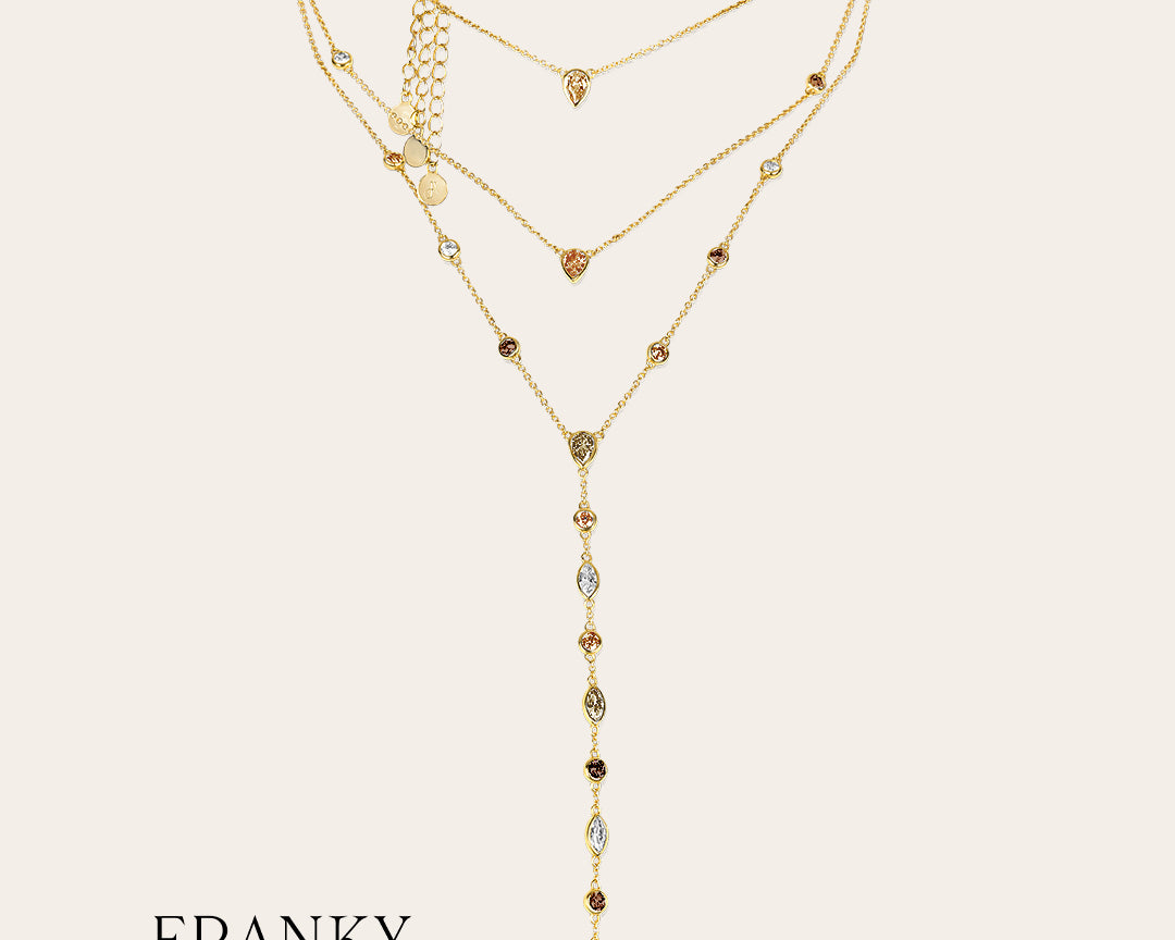 Deze driedubbele gold plated ketting is ingelegd met champagnekleurige en bruine zirkonia’s, die samen een zachte gouden glans creëren. Perfect passend bij de knusse maanden die voor ons liggen. Geïnspireerd door Jasmin’s verfijnde, vrouwelijke stijl voegt deze ketting moeiteloze elegantie toe, of je hem nu draagt met een gebreide trui overdag of bij een feestelijke avondlook.