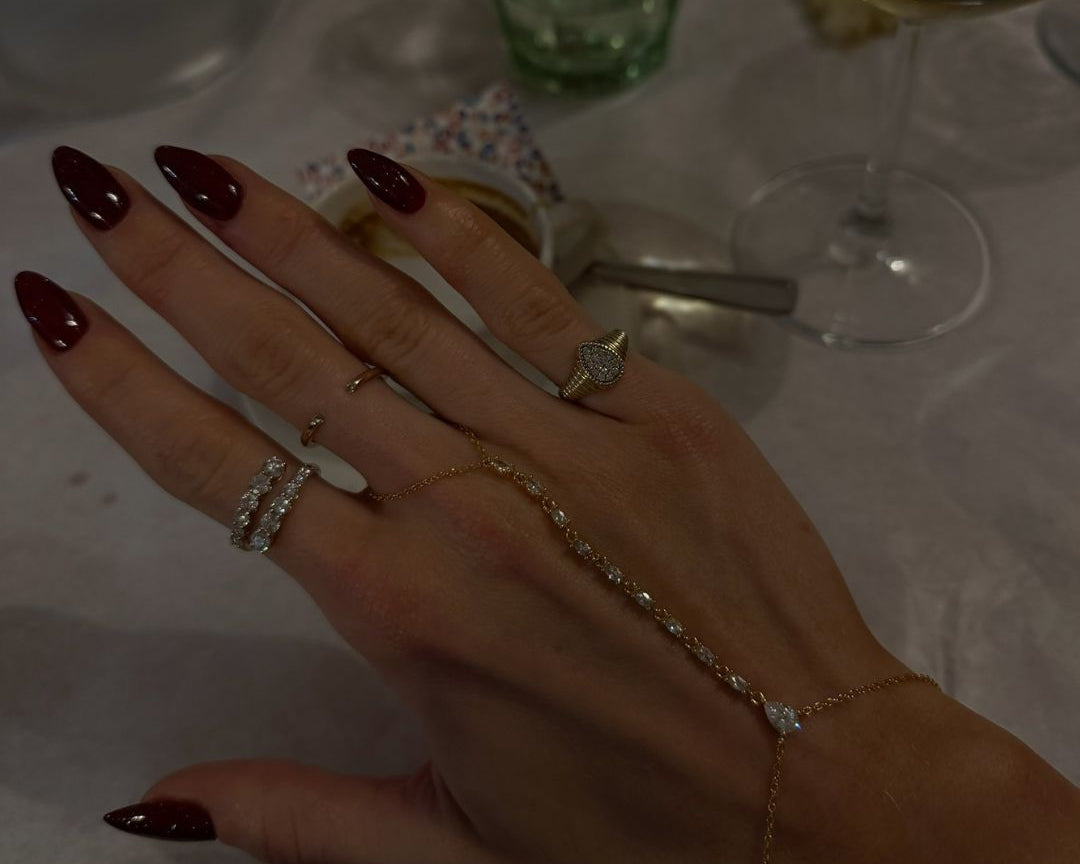 Ze straalt verfijnde elegantie uit met twee verfijnde kettingen die prachtig om je pols vallen. Of je nu op zoek bent naar een feestelijke uitstraling of dagelijkse glamour, de Chiara hand chain is het ideale accessoire.
